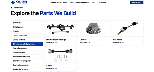 A product catalog website for an auto parts manufacturer, designed to present complex product lines in a clear and structured way. We built a digital experience that helps buyers explore categories, review components, and move smoothly from product discovery to inquiry.